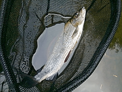 My fish of the day was when I hooked and netted a 2lb, 18/19inch Grayling under one of the foot bridge supports. It took a while to get it to the nett as it felt bigger than the norm especially when it took off. I was fully aware I was on a very light tackle set up, but I managed to unhook it, take a quick photo all in the nett, held him in the current for a while to recover then he was away, beautiful marked fish with wonderful red tipped fins.