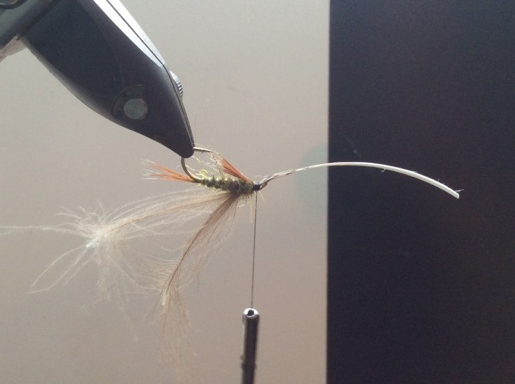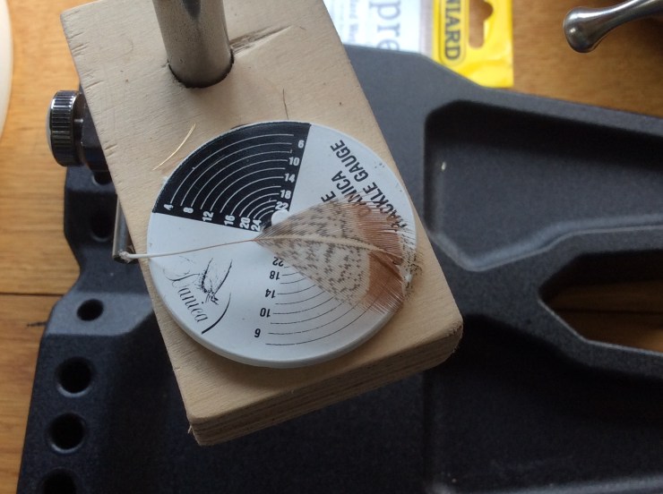 Take a Partridge feather similar to the one used for the tail, cut out the feathers to form a V shape and strip off the fibres till you have a shape as in photo.