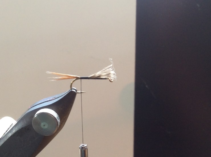 Take a Brown Partridge feather and strip off the fluff, then strip off a small bunch of fibres and tie in. Check the length and then tie in the tail to a point above the barb.