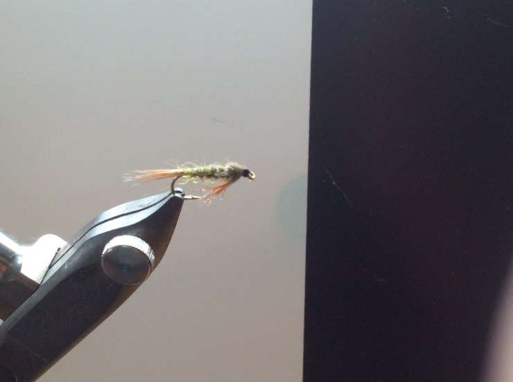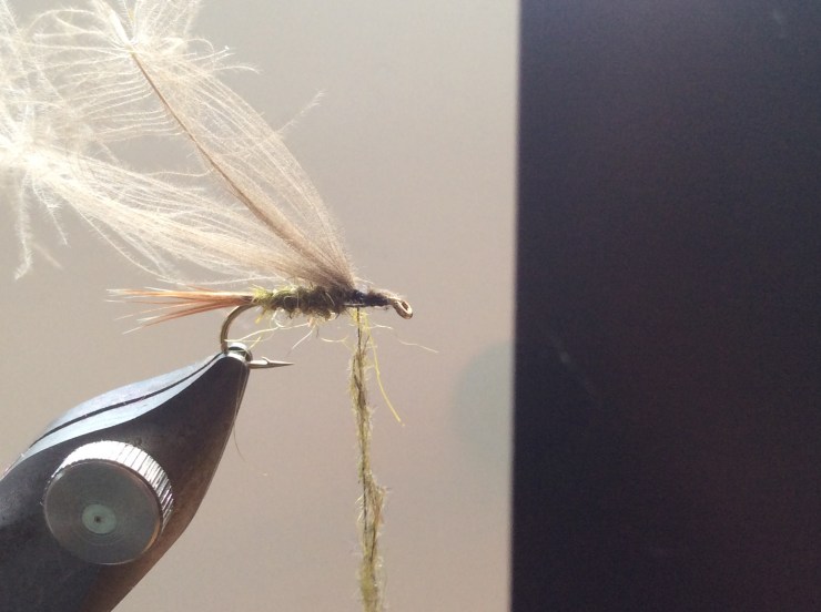 Rotate your vice to original position and bring the cdc fibres forward and tie in behind the eye to form the thorax cover. Form a neat head and tie off your thread. Varnish the head and your fly is complete