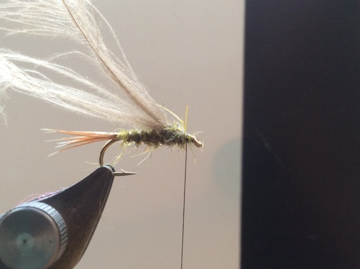 Take two cdc feathers and place together with the tips lining up and tie in front of the body with the tips facing forward.