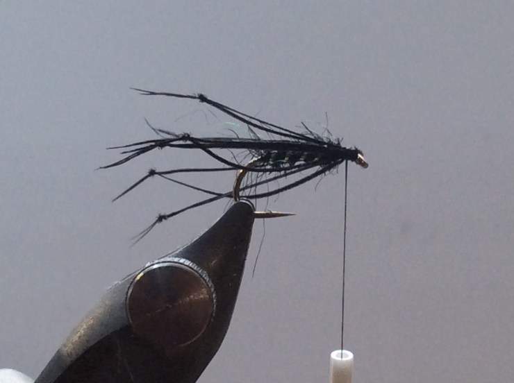 Take six hopper legs three for each side. Hopper legs will have one knot in the leg daddies have two knots. Attach three legs on one side with a couple of turns of thread. Once you are happy with the length of the legs then repeat the process on the opposite side. When you are happy with the position and length of the legs then apply turns of thread to tidy up the head.