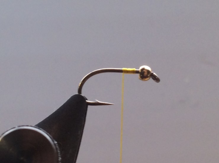 Place bead on hook and attach thread and wind down hook shank in touching turns