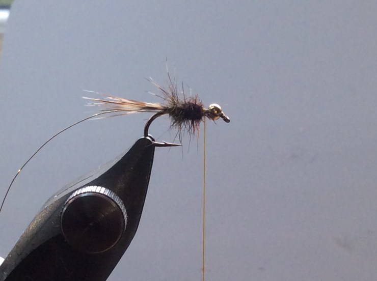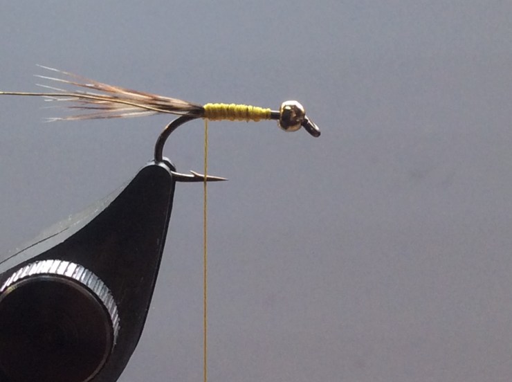 Wind the gold wire over the hares ear in even open turns and secure. Now whip finish and remove thread. Push the bead back against the hares ear dubbing and re-attach your thread in front of the bead.