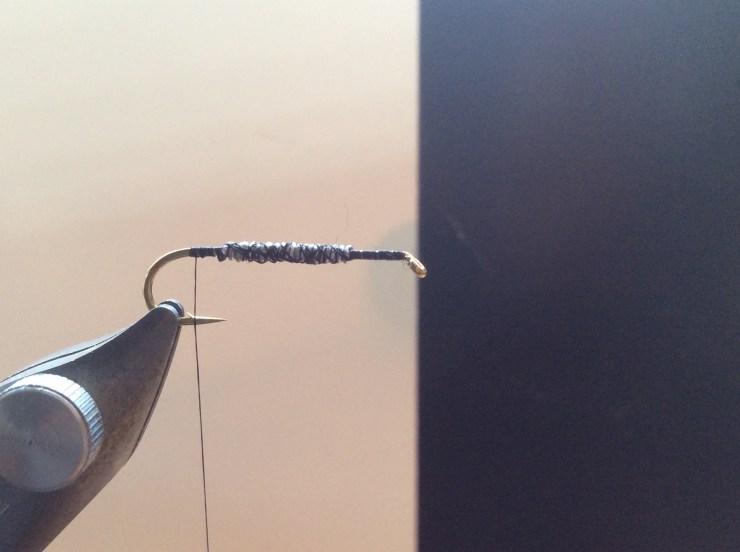 Tie in a cock grizzle hackle and with a pair of hackle pliers palmer the hackle in open turns towards the tail.