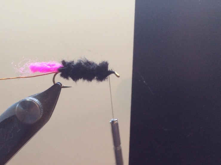 Take the thread up the body and then tie in the copper wire for the rib. Return the thread to the tail ready to tie in the black chenille. Once you have tied the chenille return the thread to just short of the eye.